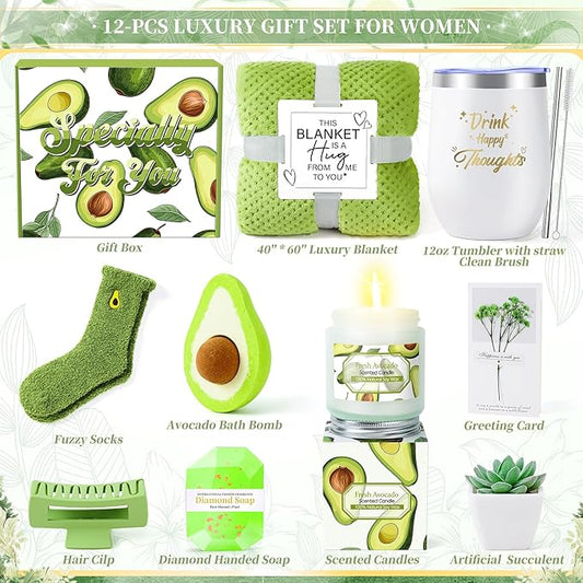 Avocado Self Care Package for Women-12PCS Avocado Themed Birthday Box for Woman Get Well Soon Gift for Women Relaxing Spa Gifts Basket Care Package with Luxury Flannel Blanket