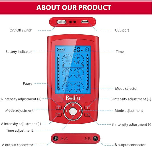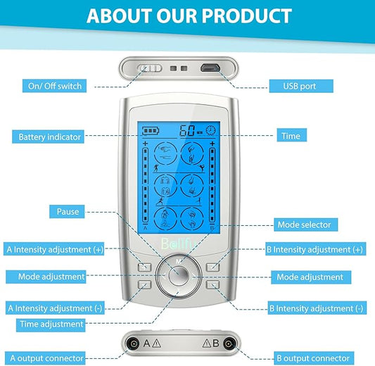 Belifu Dual Channel TENS EMS Unit 24 Modes Muscle Stimulator for Pain Relief Therapy, Electronic Pulse Massager Muscle Massager with 10 Pads, Dust-Proof Drawstring Storage Bag