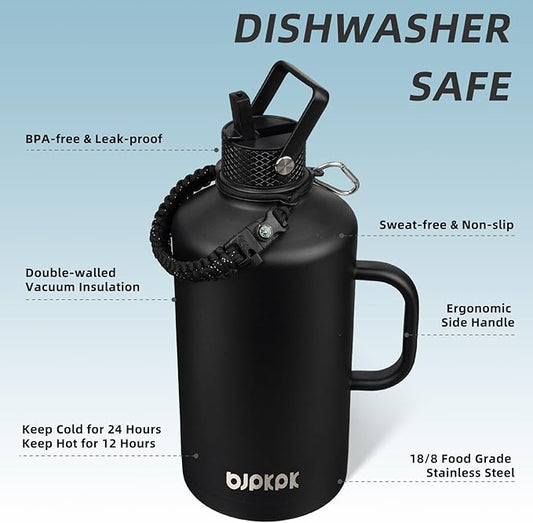 BJPKPK 1 Gallon Water Bottle Insulated with Straw Lid, 50oz, 64oz, 87oz, 128oz Large, Stainless Steel Water Bottles with 3 Lids and Paracord Strap, Double Wall Vacuum Metal Water Jug,Black