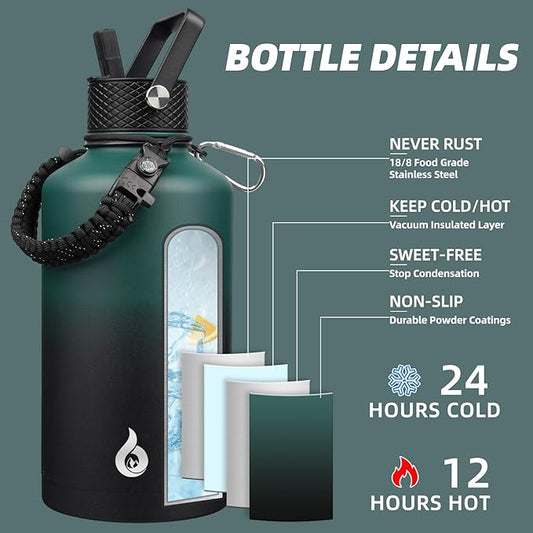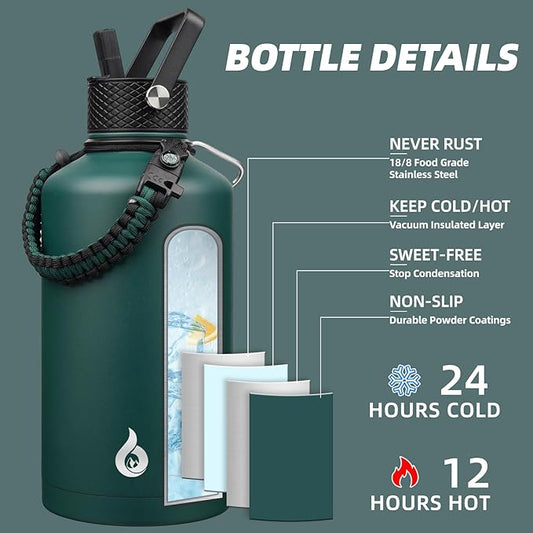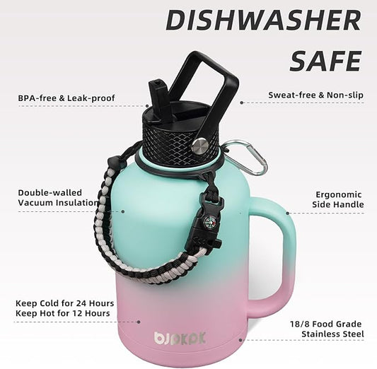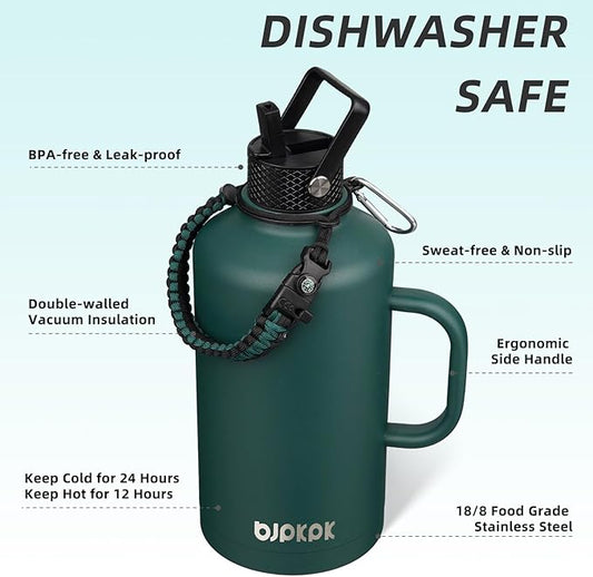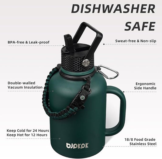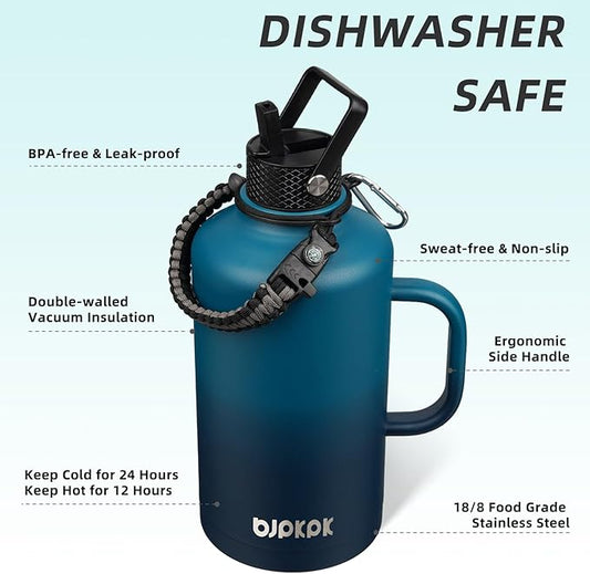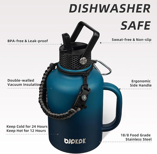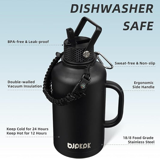BJPKPK Half Gallon Insulated Water Bottles with 3 Lids and Paracord Handle, 50oz, 64oz, 87oz, 128oz Large, Stainless Steel Water Bottles with Straw Lid, Half Gallon Water Jug,Vast
