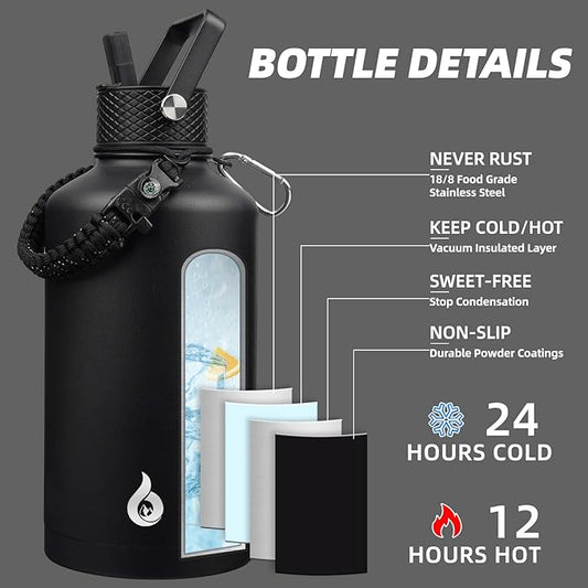 BJPKPK Half Gallon Insulated Water Bottles with Straw Lid & Side Handle, 50oz, 64oz, 87oz, 128oz Large, Stainless Steel Water Bottles with 3 Lids and Paracord Strap, Metal Water Jug,Black