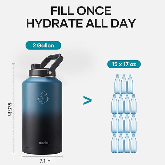 BUZIO 2 Gallon Water Bottle Insulated, (Cold for 48 Hrs) 256oz Extra Large Water Jug Stainless Steel, 4.4in Big Wide Mouth Leak Proof Metal Flask with Handle for Camping,Work,Travel, Indigo Black