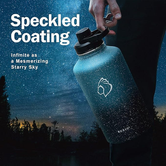 BUZIO 64 oz Water Bottle Insulated with Straw & 3 lid and Carrying Pouch, Leak Proof Half Gallon Stainless Steel Water Flask Jug, Cold for 48 Hrs Double Vacuum Thermo Canteen, BPA-Free, Starry Indigo