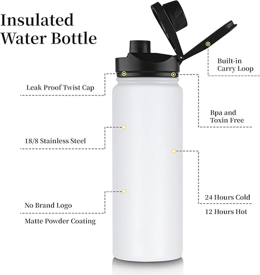 24 oz Insulated Water Bottle with Straw Lid & Wide Mouth Lids, Stainless Steel Sports Water Bottles, Double Walled Vacuum, Leak Proof, White
