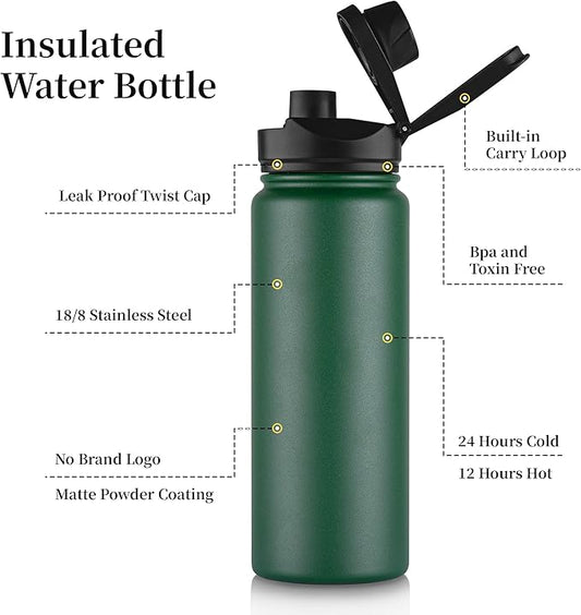 24 oz Insulated Water Bottle with Straw Lid & Wide Mouth Lids, Stainless Steel Sports Water Bottles, Double Walled Vacuum, Leak Proof, Dark Green