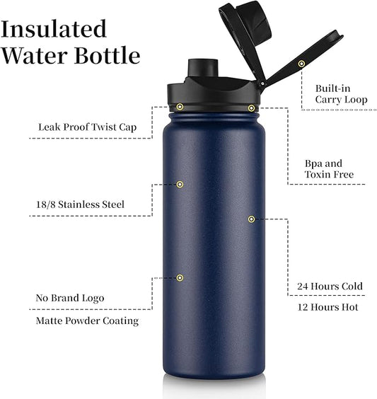 24 oz Insulated Water Bottle, 2-in-1 Lid, Straw & Spout with Protected, Leak Proof, Keep Cold, Stainless Steel, Metal, Reusable, Handle, for Travel, Gym and School, 2 Lids, Midnight Black