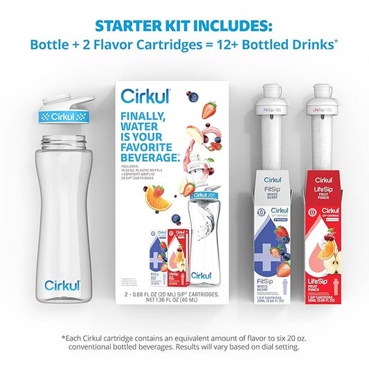 Cirkul 22oz. BPA-Free Plastic Water Bottle Starter Kit with Blue Lid, 2 Flavor Cartridges (1 LifeSip Fruit Punch, 1 FitSip Mixed Berry) No Sugar, Zero Calorie Drink Mix