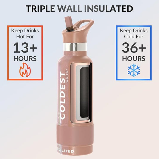 Coldest Insulated Water Bottle with Straw Lid - Stainless Steel Metal Insulated Bottle for Men & Women (Rose Gold Glitter, 21 oz)