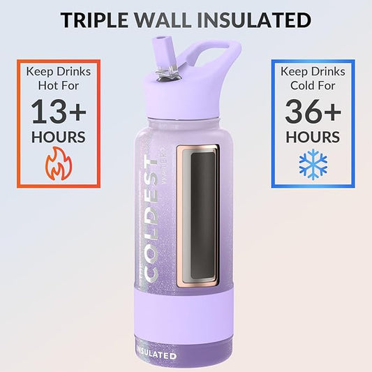 Coldest Insulated Water Bottle with Straw Lid - Stainless Steel Metal Insulated Bottle for Men & Women (Purple Glitter, 32 oz)
