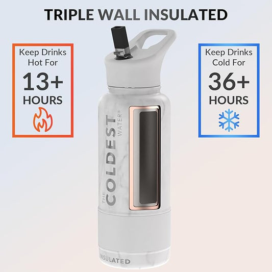 Coldest Insulated Water Bottle with Straw Lid - Stainless Steel Metal Insulated Bottle for Men & Women (Marble White, 32 oz)