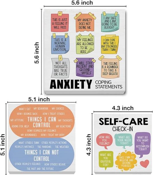 3 Pcs Mental Health Wood Signs Decor Psychology Wood Block Signs Anxiety Coping Statements Things I Can Control Self Care Wooden Box Signs Home Therapy Office Decorations for Tiered Tray Desk Shelf