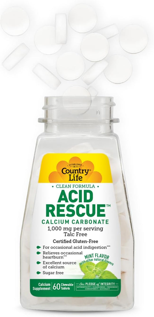 Country Life Acid Rescue Chewable Tablets - Certified Vegan & Gluten-Free Heartburn Relief, 400mg Calcium & Magnesium, Non-GMO, Sugar-Free Mint Flavor, Supports Bone Health, 60 Count