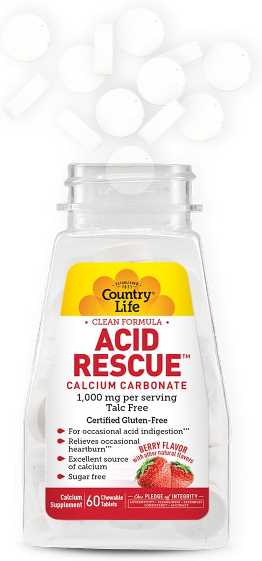 Country Life Acid Rescue Chewable Tablets - Certified Vegan & Gluten-Free Heartburn Relief, 400mg Calcium & Magnesium, Non-GMO, Sugar-Free Berry Flavor, Supports Bone Health, 60 Count