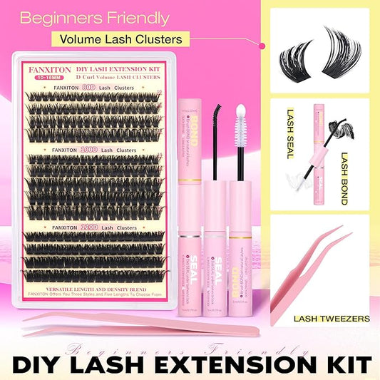 D Lash Clusters Kit Thick Lash Extension Kit Volume Lash Clusters 80D+100D+120D Eyelash Clusters Kit 10-18mm Individual Lashes with Bond and Seal by FANXITON