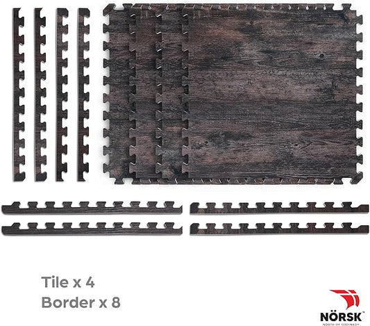 Décor by NÖRSK Reversible Interlocking Faux Wood Foam Floor Tiles, 24 X 24 X .47", 4-Pack, 16 Square Feet, Dark Walnut/Black