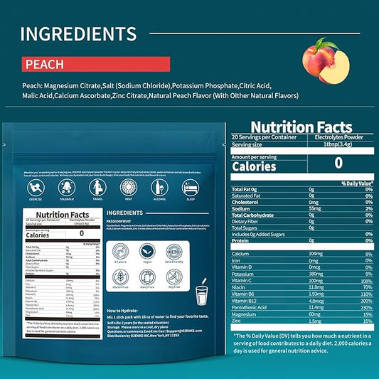 Electrolytes Powder Packets, Hydration Packets, Electrolytes Sugar Free, Portable Electrolyte Drink Mix for Rapid Hydration, No Sugar & Low Sodium | 0 Calorie | Peach Flavor | 20 Sticks