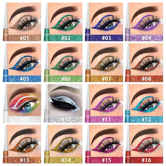evpct 16 Color Liquid Glitter Eyeliner Sets Eyeliner Glitter Liquid Liners for Women White Silver Rose Gold Pink Sparkly Sparkle Shimmer Eyeliners delineador con glitter de colores para ojos colores