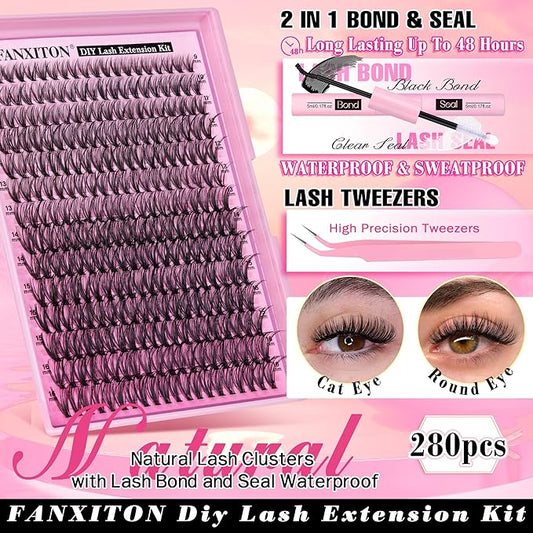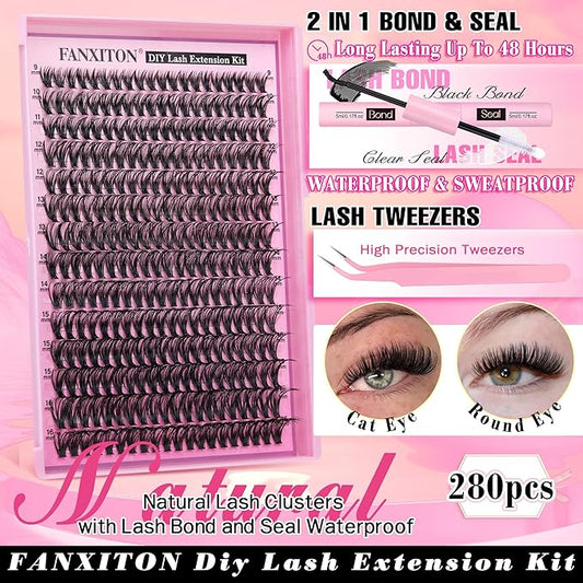 FANXITON DIY Lash Extension Kit 30D D Individual Lashes Lash Clusters Kit Cluster Lashes Lash Bond and Seal and Lash Tweezers for Lash Clusters Kit DIY at Home