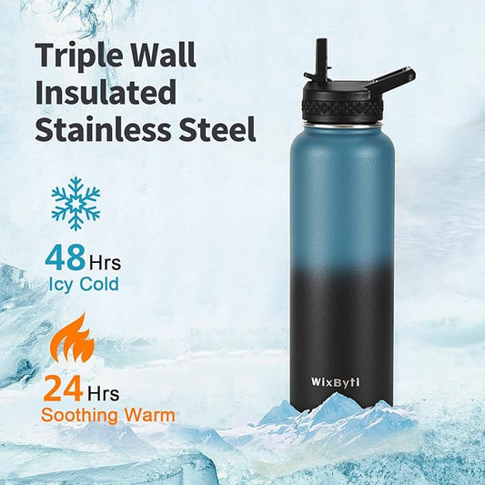 40 oz Insulated Water Bottle with Straw, Stainless Steel Sports Water Bottles with 2 Lids (Straw and Wide Mouth lid), Double Wall Vacuum, Leakproof, BPA-Free, Blue Black Gradient