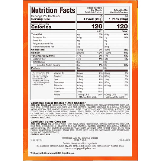 Goldfish Dynamic Duo Variety Pack, Colors Cheddar & Flavor Blasted Xtra Cheddar, Snack Packs, 20 Ct