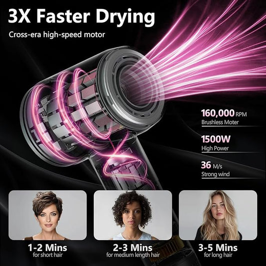 Hair Dryer, 150000 RPM High-Speed Brushless Motor Negative Ionic Blow Dryer for Fast Drying, Low Noise Thermo-Control Hair-Dryer-with-Diffuser and Nozzle