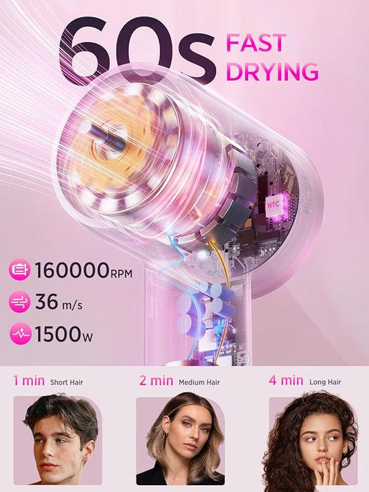 Hair Dryer - 150000 RPM High-Speed Brushless Motor Negative Ionic Blow Dryer for Fast Drying, Low Noise Thermo-Control Hair Dryer with Diffuser and Nozzle, Pink