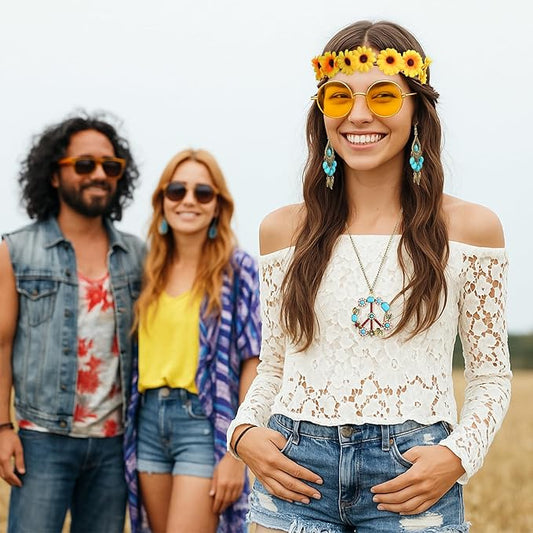 Hicarer Hippie Costume Accessories Include Sunglasses, Peace Sign Necklace, Boho Headband and Earring for 60s 70s Party