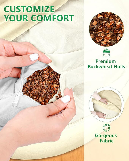 Hihealer Meditation Cushion Set Large Cotton Floor Pillow & Traditional Tibetan Yoga Bolster for Adults Zafu Meditation Mat with Buckwheat Filling (Pure White)