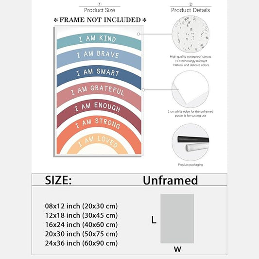 I am Kind Brave Loved Enough Motivational Canvas Wall Art Print Rainbow Quote Inspirational Art Poster Trendy Office Affirmation Wall Decor Minimalist Picture Painting Home Decor 16x24inch Framed