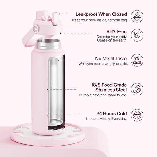 Insulated Water Bottle with Straw Stainless Steel Water Bottle, Leak-Proof, BPA-Free, Double Wall Vacuum Keeps Cold for 24 Hours for Sports, Travel, School (32 oz, Peach Dream)
