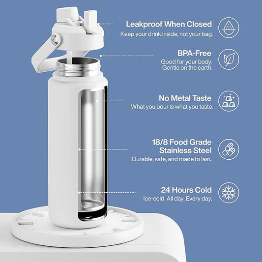 Insulated Water Bottle with Straw Stainless Steel Water Bottle, Leak-Proof, BPA-Free, Double Wall Vacuum Keeps Cold for 24 Hours for Sports, Travel, School (32 oz, Polar White)
