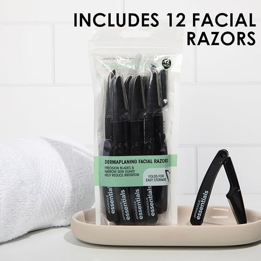 JAPONESQUE Essentials Dermaplaner Facial Hair Razors 12 Pack – Precision Blades for Peach Fuzz Removal, and Eyebrow Shaping for Men & Women