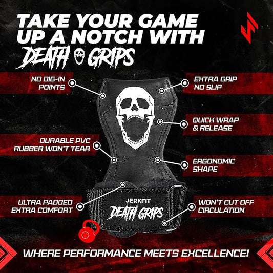 JerkFit Death Grips Premium Lifting Straps - Car Tire Grade Rubber PVC Wrist Straps for Shrugs, Pull Ups & Deadlifts with Neoprene Padded Support