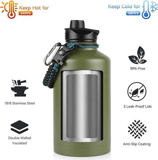 64 oz Insulated Water Bottle with Sleeve, Half Gallon Stainless Steel Tactical Water Jug Large Military Water Bottle with 3-IN-1 Pouch/3 Lids/Straw/Paracord Handle for Gym, Camping, Workout