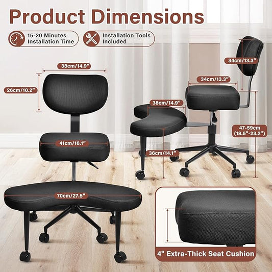Meditation Cross Legged Chair PRO, ADHD Chair with Height Adjustable Backrest, Criss Cross Desk Use with Footrest and Wheels for Home Office, Flexible Design for Fidgety Sitters, Black