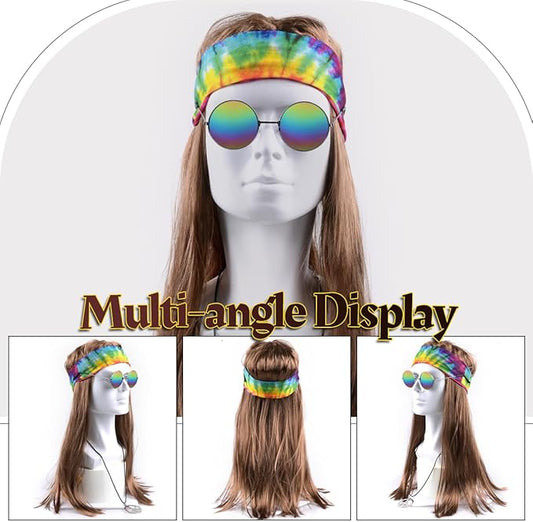 MOVINPE Hippie Accessories for Men - Hippie Wig Sunglasses Peace Sign Necklace Tie Dye Headbands, Halloween Costume 70s Disco Style 60s Outfit Fancy Dress Retro Night