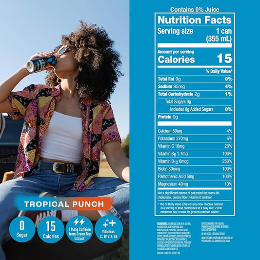 Yesly Energy Drink, Tropical Punch, Naturally Flavored Sparkling Energy Drink With Electrolytes, Magnesium, Potassium, Vitamin C, B6 & B12, Natural Caffeine From Green Tea, 12 Fl Oz Cans, 12 Pack