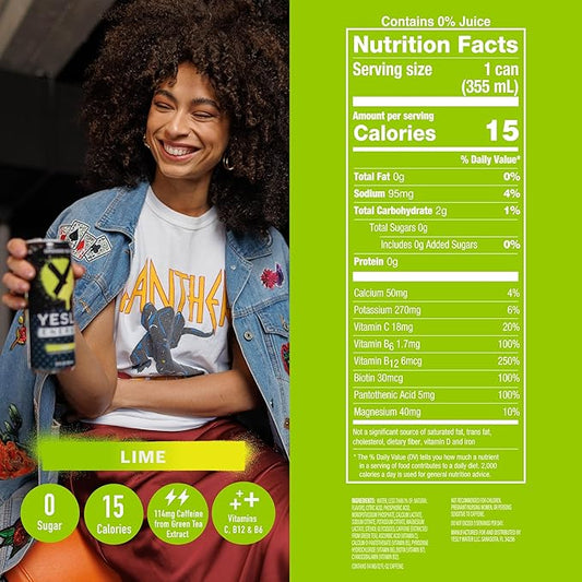 Yesly Energy Drink, Lime, Naturally Flavored Sparkling Energy Drink With Electrolytes, Magnesium, Potassium, Vitamin C, B6 & B12, Natural Caffeine From Green Tea, Zero Sugar, 12 Fl Oz Cans, 12 Pack