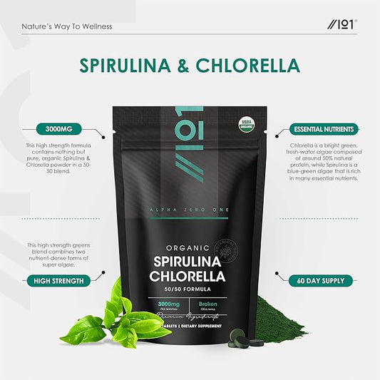 ALPHA01 Organic Spirulina Chlorella Tablets 3000mg – 360 Counts – 50/50 Blend Superfood – No Filler, No Additives, Cracked Cell Wall – Rich in Vegan Protein & Chlorophyll