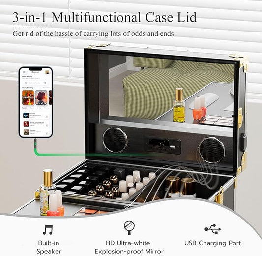 Icoget Portable Rolling Manicure Table for Nail Teach, Foldable Traveling Nail Desk w/Storage, Mobile Nail Table w/Audio and Mirror, Makeup Train Case Cosmetic Trolley, Black