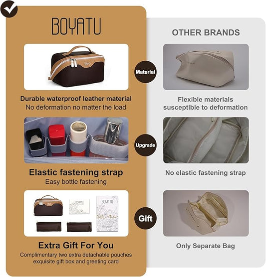 BOYATU Travel Makeup Bags for Women: Large Capacity Cosmetic Bag Set of 3 - Vegan Leather Make up Bags with Compartments - Wide Open Waterproof Toiletry Organizer Bag with Handle (E-05-Brown)