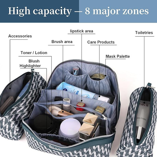 BOYATU Travel Makeup Bags for Women: Large Capacity Cosmetic Bag Set of 3 - Vegan Leather Make up Bags with Compartments - Wide Open Waterproof Toiletry Organizer Bag with Handle (E-02-Blue)