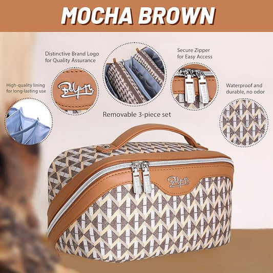 BOYATU Travel Makeup Bag Organizer Cosmetic Bag: 3 Pcs Set Make up Bags for Women with Handle - Waterproof Vegan Leather Toiletry Bags Travel Essentials Pouch with Compartments (D-01-Brown)