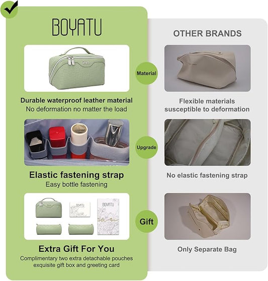 BOYATU Travel Makeup Bag Organizer Cosmetic Bag: 3 Pcs Set Make up Bags for Women with Handle - Waterproof Vegan Leather Toiletry Bags Travel Essentials Pouch with Compartments (F-02-Green)