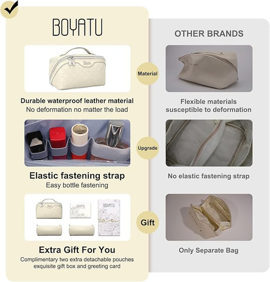 BOYATU Travel Makeup Bag Organizer Cosmetic Bag: 3 Pcs Set Make up Bags for Women with Handle - Waterproof Vegan Leather Toiletry Bags Travel Essentials Pouch with Compartments (C-04-Beige)