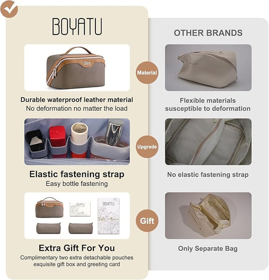 BOYATU Travel Makeup Bag Organizer Cosmetic Bag: 3 Pcs Set Make up Bags for Women with Handle - Waterproof Vegan Leather Toiletry Bags Travel Essentials Pouch with Compartments (G-01-Brown)