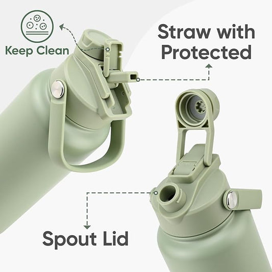 32 oz Insulated Water Bottle, 2-in-1 Lid, Straw & Spout with Protected, Leak Proof, Keep Cold, Stainless Steel, Metal, Reusable, Handle, for Outdoor, Gym and School, 2 Lids, Sage Green