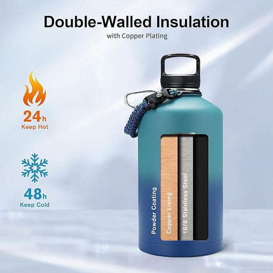 Trebo 1 Gallon(128oz) Water Bottle Insulated with Paracord Handle and Straw,Vacuum Double Wall Stainless Steel Large Jug Keep Cold 48 Hours, Leakproof & BPA Free for Men Gym/Hiking/Camping, Cyan Blue