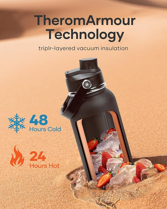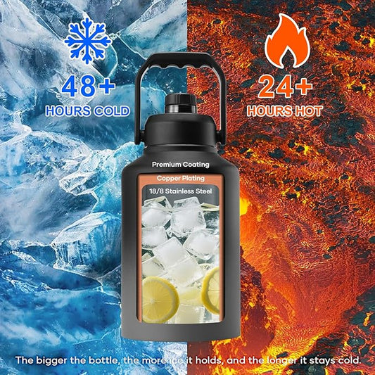 One Gallon Water Bottle,128oz Insulated Water Flask Stainless Steel Vacuum, Cold for 48 Hrs,BPA-Free & Leakproof -with Paracord Handle,Strap,Straw Spout Lids,Large Jug for Gym Sports,Black