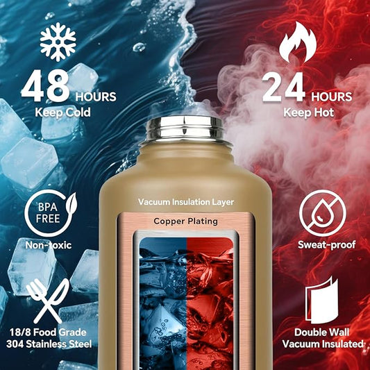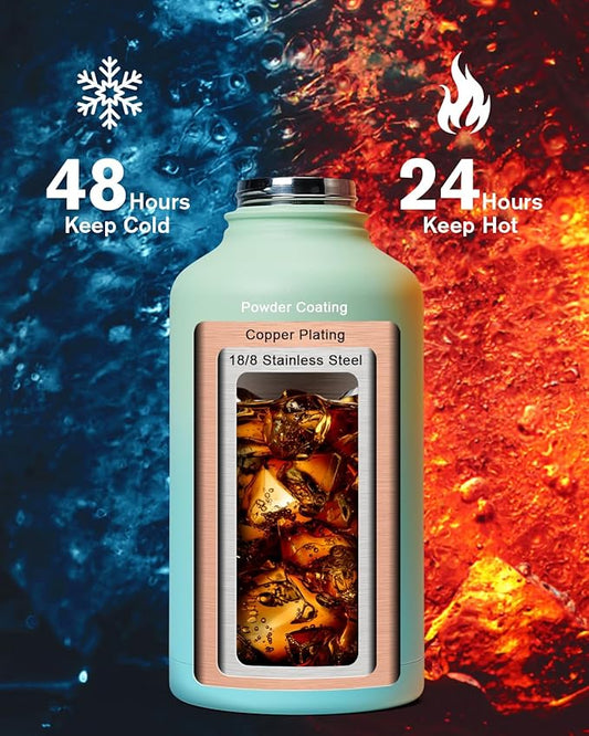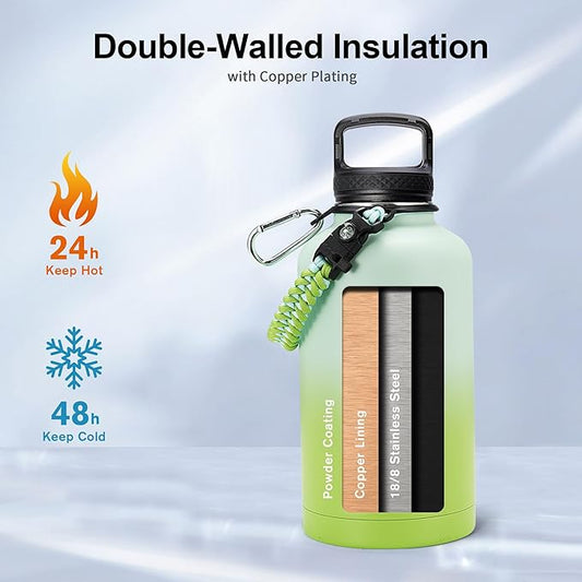 Insulated Water Bottle 64oz,Half Gallon Water Flask Stainless Steel Vacuum, Cold for 48 Hrs,BPA-Free & Leakproof -with Paracord Handle, Strap,Straw Spout Lids,Large Jug for Gym Sports,Green